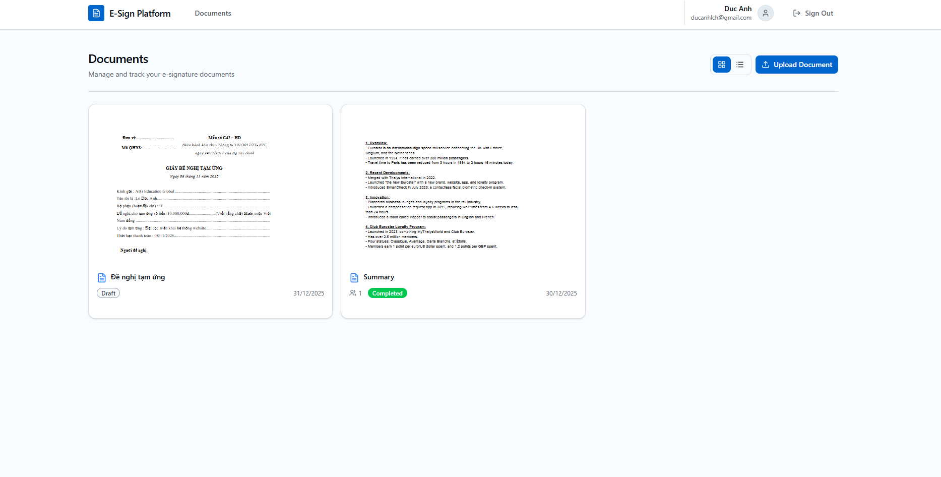 Tổ chức và theo dõi tất cả tài liệu của bạn trên một bảng điều khiển tập trung. Giám sát trạng thái tài liệu, người nhận và hoàn thành theo thời gian thực.